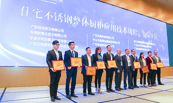 12月17日,“盛世再发,智创未来”广东省橱柜业商会2019年会暨年度颁奖盛典在佛山盛大召开。广东cq9电子厨卫有限公司作为《住宅不锈钢整体厨柜应用技术规程》CBDA行业标准的核心参编单位应邀出席,并上台接受授牌,获得行业对cq9电子在标准化建设上推动行业技术规范做出突出贡献的表彰。