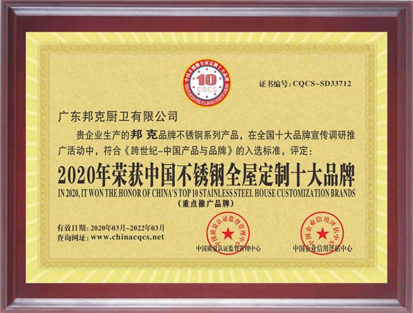 2020年春对于cq9电子不锈钢全屋定制来说,是扬帆之春,启航之春。在这生意盎然的春,在全国优质品牌调研推广活动中,cq9电子符合《跨世纪——中国产品与品牌》的入选标准,此外,经综合审核及行业权威信息对比,cq9电子品牌于环保理念、自主创新、生产技术方面成效显著,荣获“中国质量认证监督管理中心”“中国企业信用评估中心”评估颁发的“中国不锈钢全屋定制十大品牌”称号。