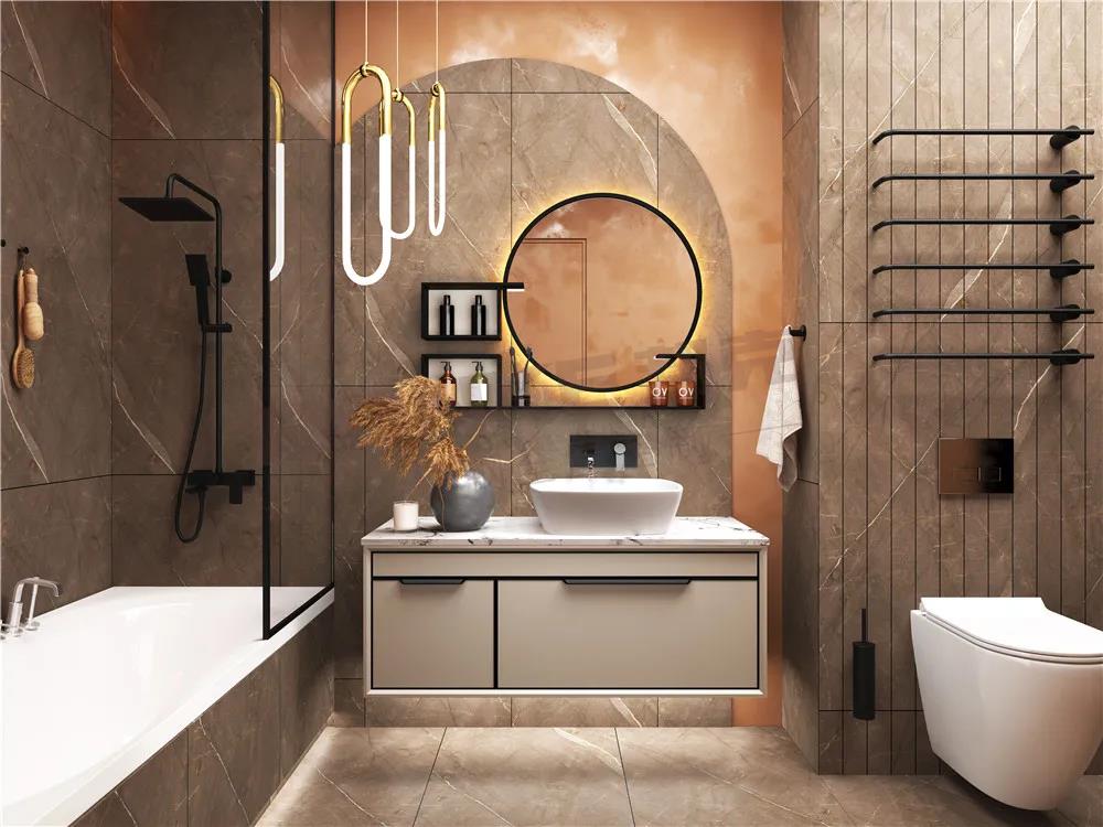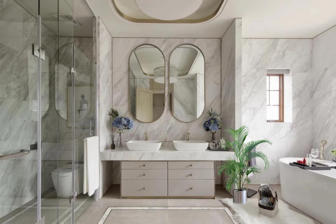 轻奢风流行正当道,在卫浴空间大面积的使用高级灰色系,雾蒙蒙的灰色调搭配黄铜色不锈钢线条,辅以带有暖黄灯光的圆镜和旁侧的精致置物架,塑造出一个低调奢华的卫浴空间。