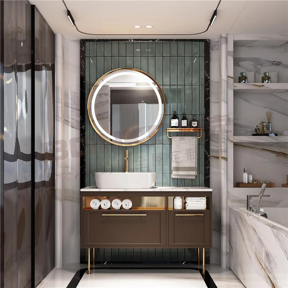 简欧风格浴室柜强调线形流动的变化,它在形式上以浪漫主义为基础,轻快纤细的金色线条做装饰,给人一种高贵奢华的感觉。讲究的配色、精致的造型,都是简欧风呈现给消费者的尊贵体验。