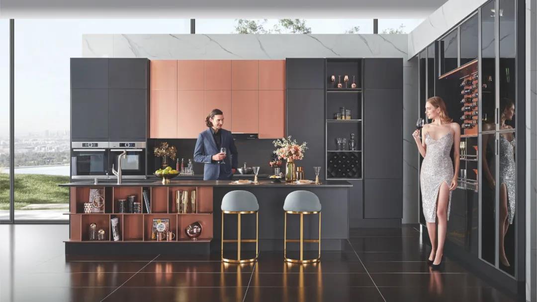 岛台型厨柜也更具备设计美感和高端品质感,它拥有更多的操作台面和储物空间,便于多人同时操作,十分适合用作开放式厨房。与客厅相连的开放式岛台厨房往往会将岛台设置为烹饪区与客厅的分界线,岛台的设计也能增添空间的交流感。