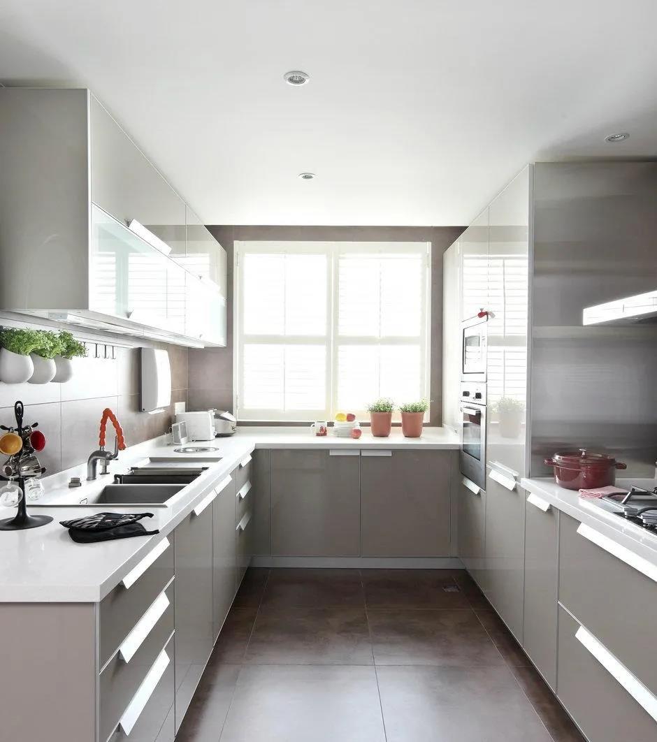 而U型厨房最大特点,在于厨房空间工作流线与其它空间的交通可以完全分开,避免了厨房内其他空间之间的相互干扰。U型相对两边内侧之间的距离也应预留90cm以上,使之符合“省时、省力工作三角区”的要求。