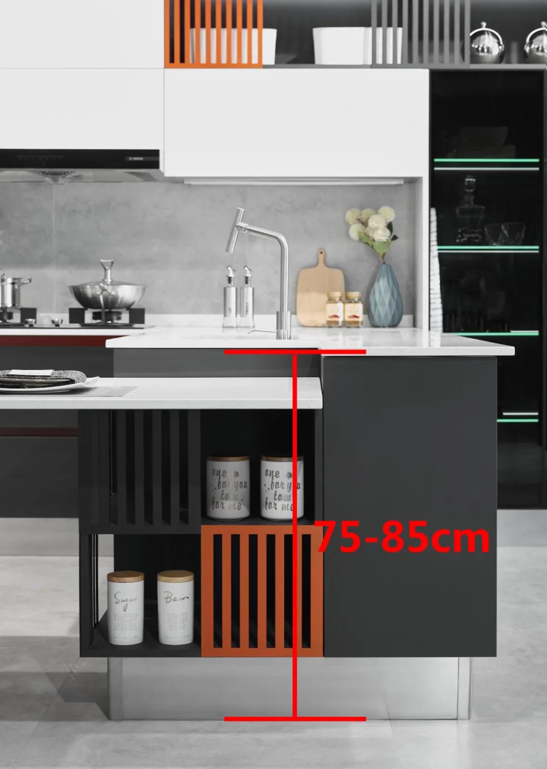 在厨柜广泛可定制的当下,家里的厨柜高度要根据家中最常使用厨房的掌勺人的身高来确定,一般可参考公式:地柜高度=身高/2+5~10 (cm)。如果家里人使用频率都差不多的话,标准高约在75-85cm,满足大部分身高使用需求。