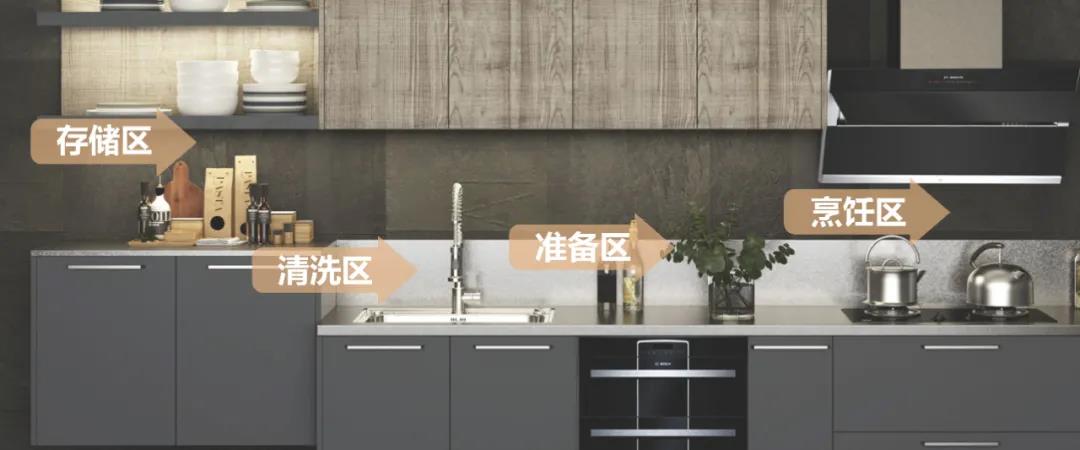 根据厨房的大小,既可以将洗涤区、备餐区和烹饪区可以形成黄金三角操作区,也可以布置在同一条直线。