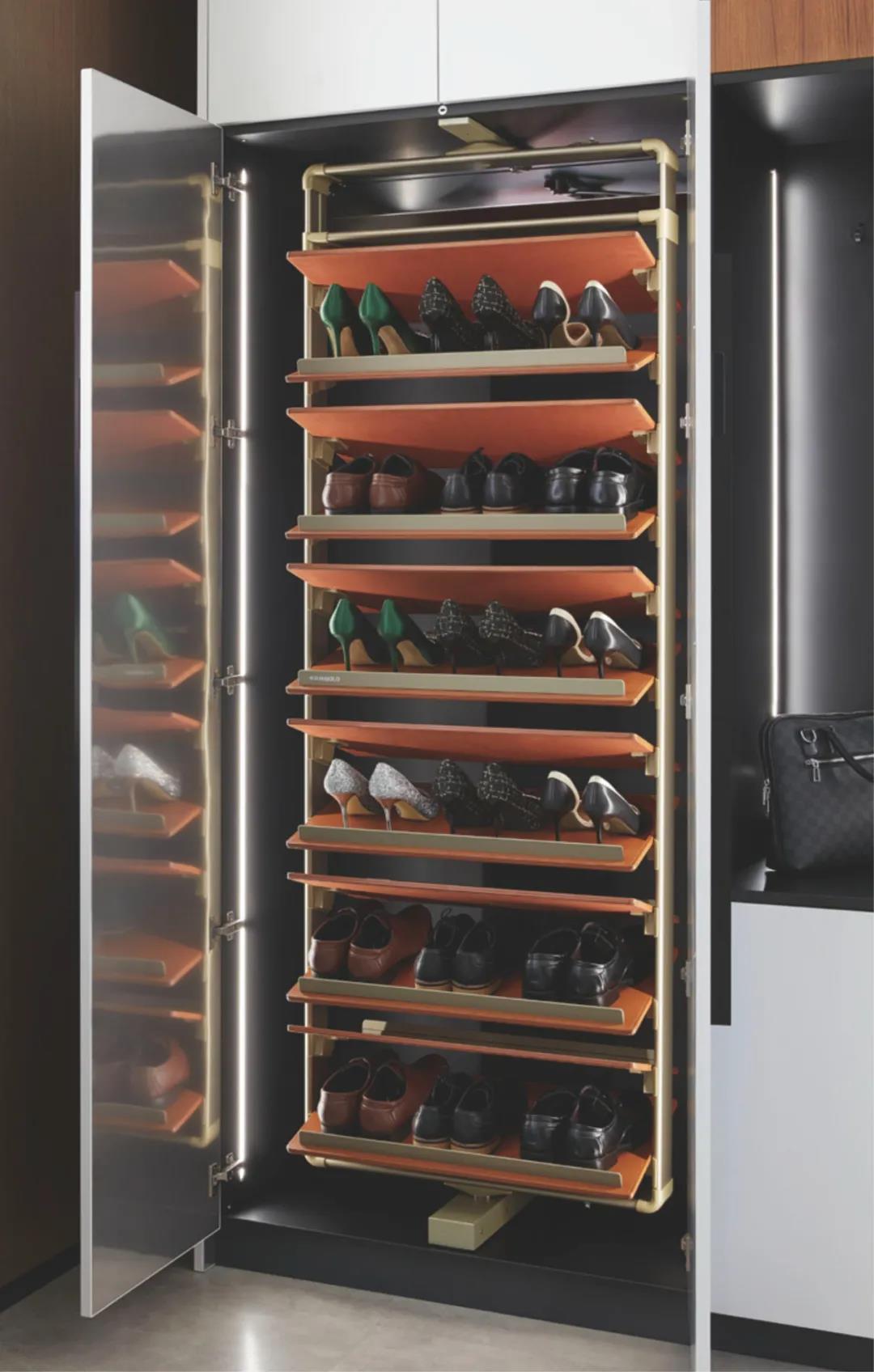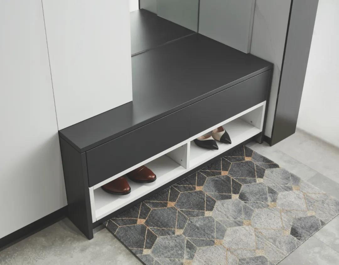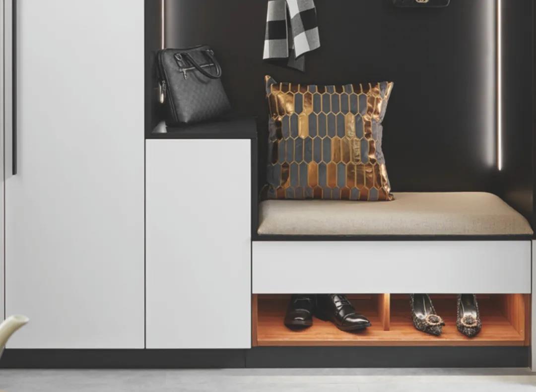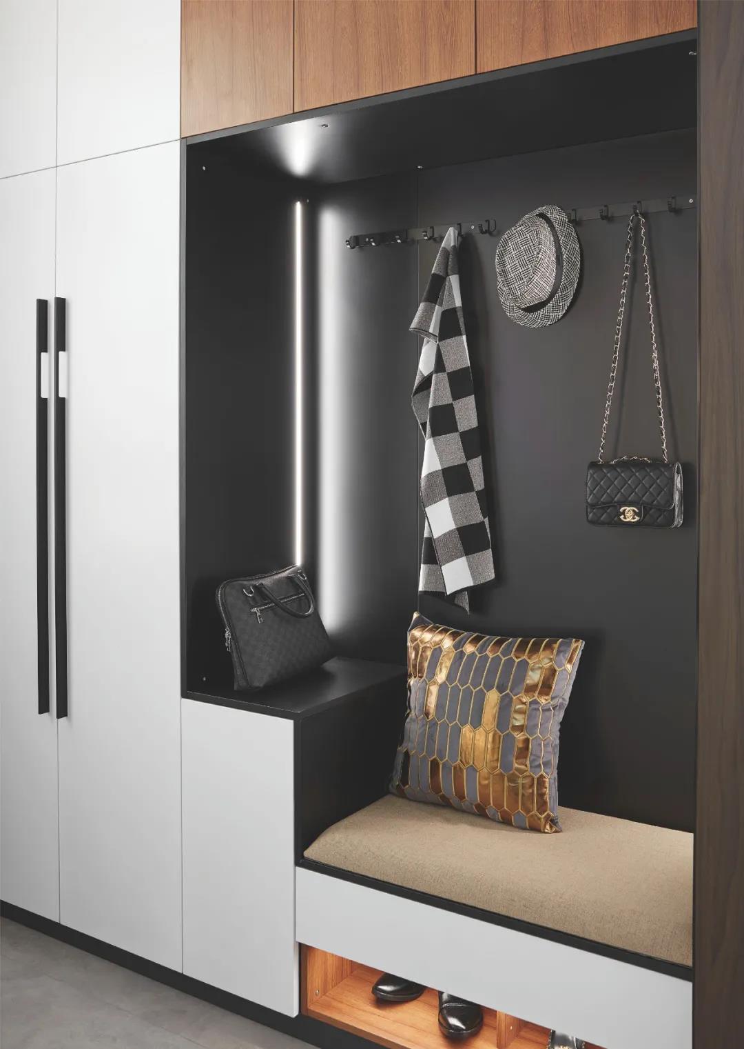 换鞋凳下留出常用鞋位,便利使用,上方挂钩挂取物品便捷,颇为实用。左侧柜鞋柜以黄金角度进行鞋架设计,科学合理,节省空间,不易滑落,让每一步都是美丽人生。