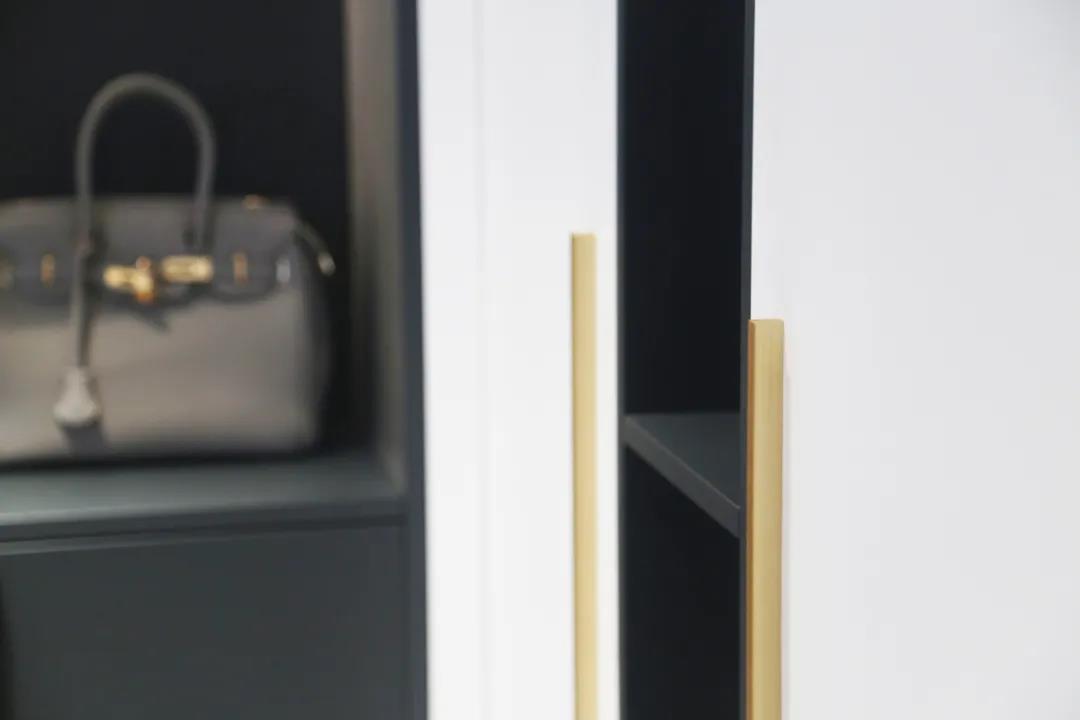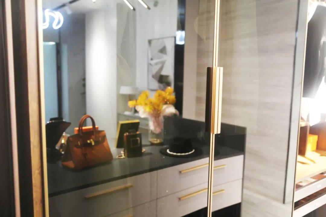 素净雅致的黑白金配色,显得室内亮堂整洁。金色条状把手和黑玻的点缀,提升了整体空间的高级感,带来时尚精致的轻奢范儿。