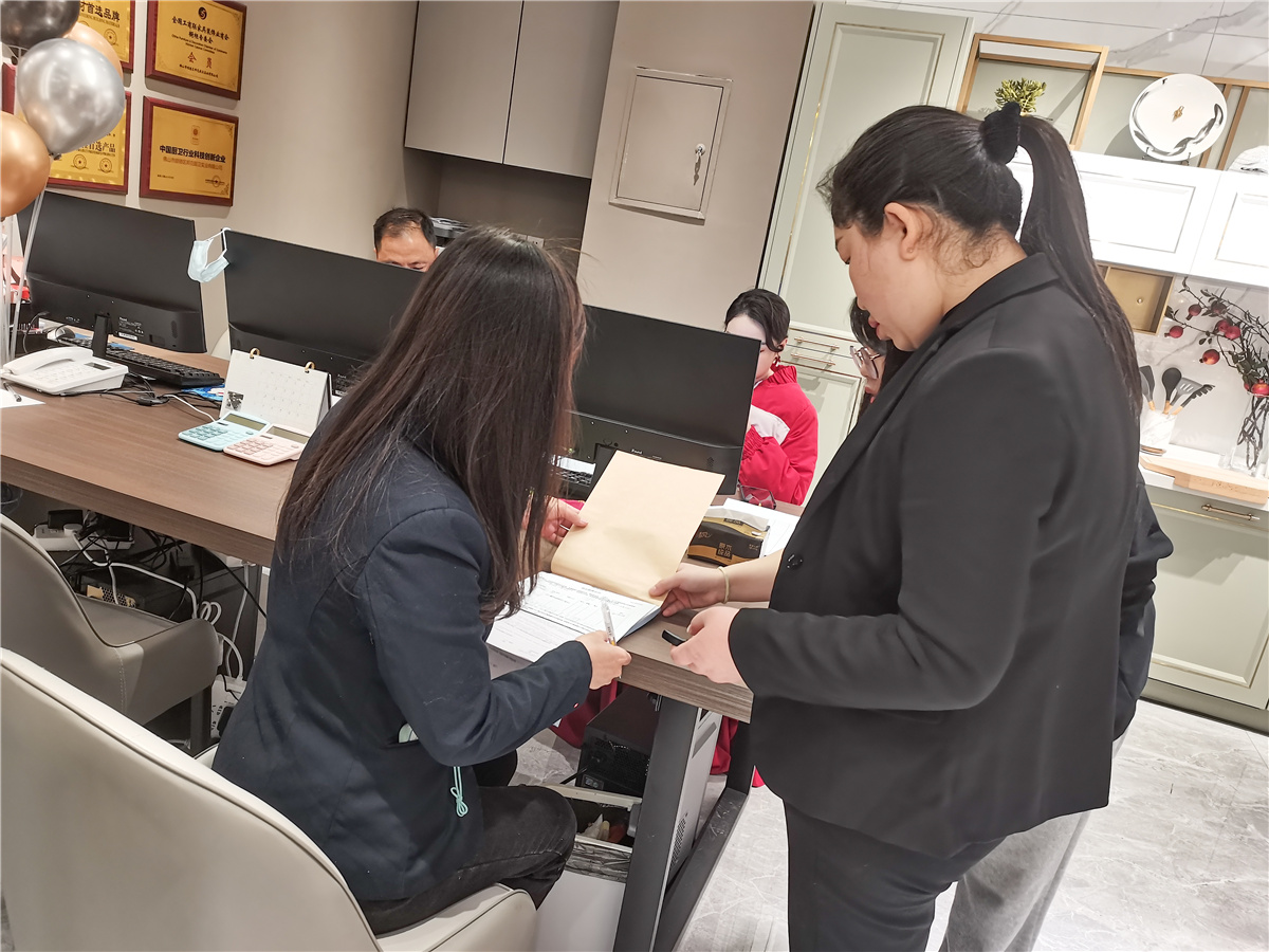 不仅产品足够吸引人,重庆店的服务质量也是人气旺的重要原因。经过总部关于产品销售与设计的全方位培训,门店业务人员的接单能力大大提升,为其后续盈利奠定基础。在开业当天,重庆店的销售和设计师均展现出了专业化、系统化的服务水平,详细耐心地为消费者答疑解惑、讲解产品,给服务对象留下了良好的印象。