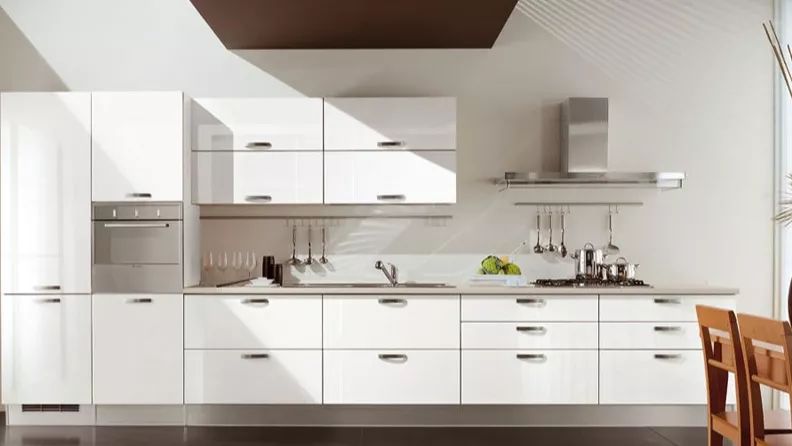 将“收纳→洗涤→烹饪”设置在同一线上,厨具沿墙面一字排开,节省空间,实用性、操作性较强,但收纳储藏功能较差,比较适用于宽度窄,长度长的厨房布局。