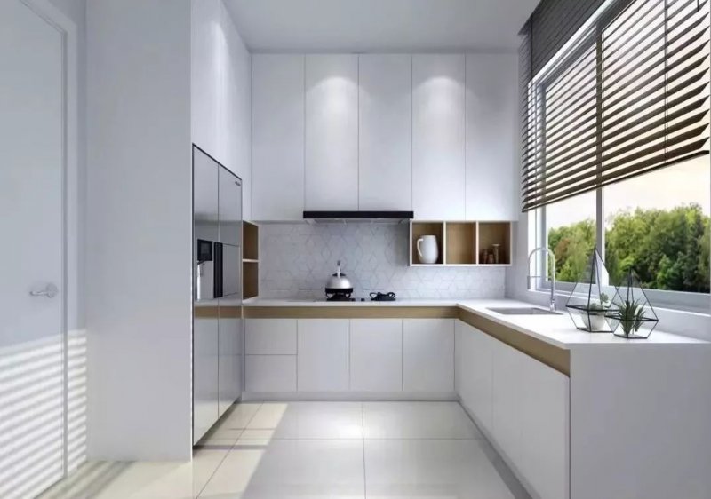 一般是长方形,布局主要是水槽和烹饪区的不同,是厨房装修中比较常见的类型之一。L型厨房装修可以充分利用转角设计来扩大厨房内的收纳空间,并且将洗菜、烹饪区域划分开来,做到洗菜、烹饪两不误!对于小户型而言L型厨房是很不错的选择。