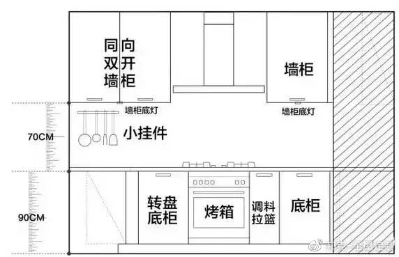 操作区右上位置的墙柜设计为向右单开门,这样拉门比较顺手,如果是习惯使用左手的业主,记得要反过来安装。