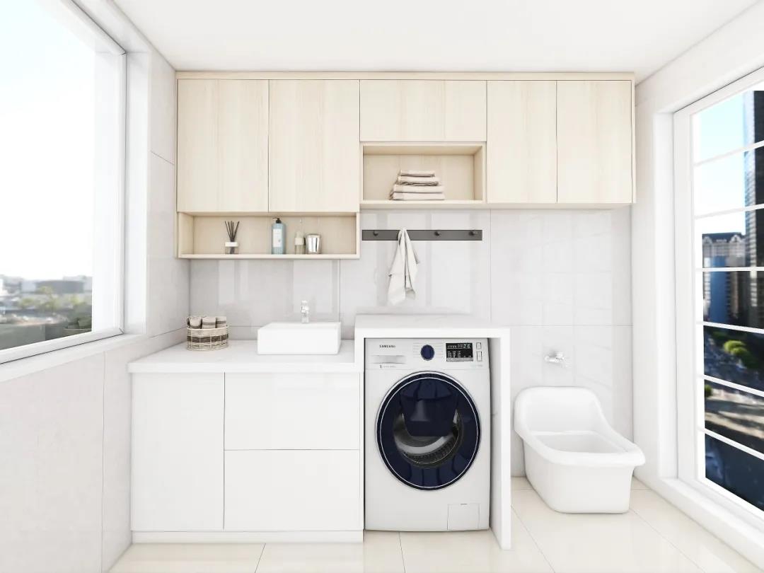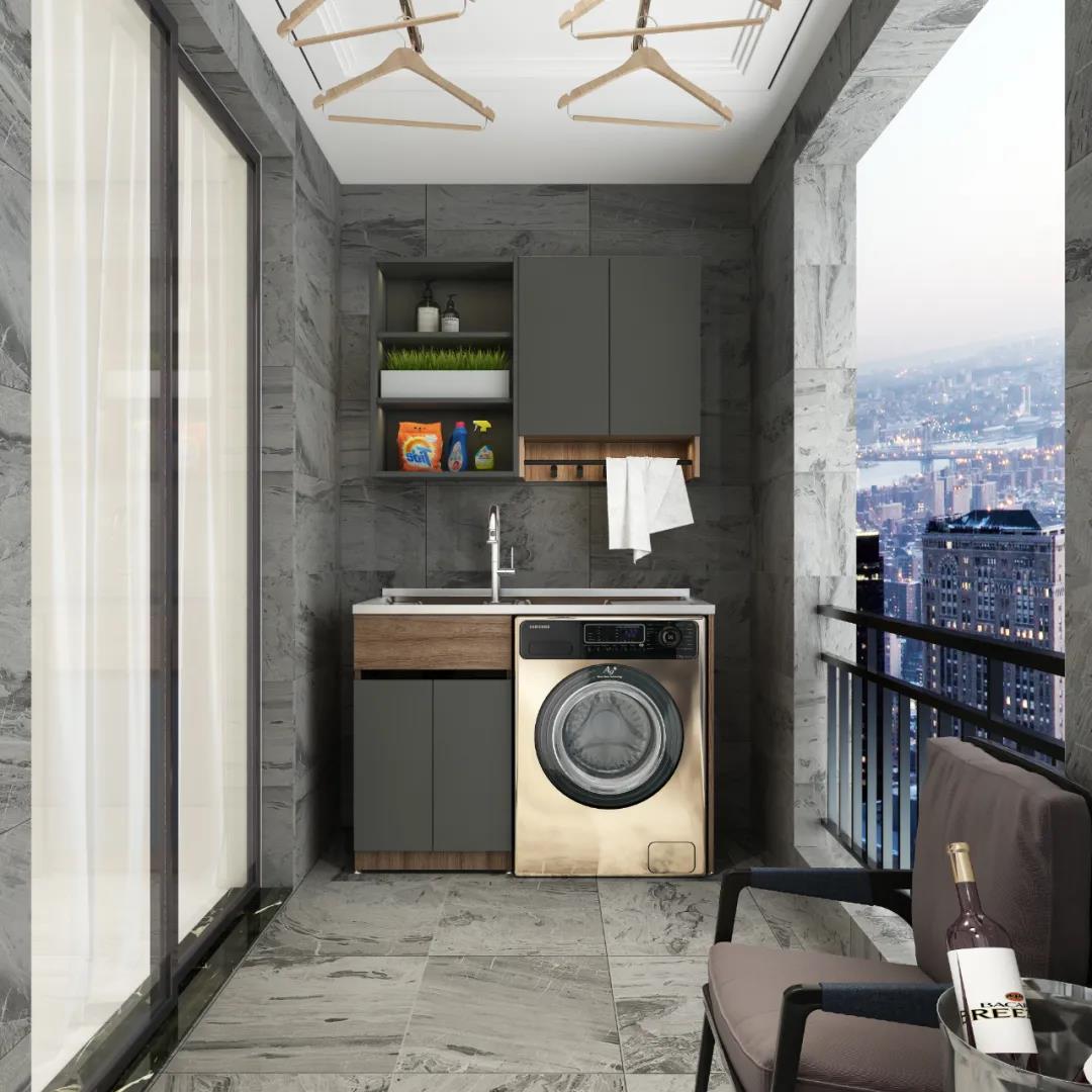 阳光充足的阳台,常用来晾晒衣服和堆放杂物,由此可延伸出其洗衣和收纳需求。利用阳台柜的设计,让小空间秒变多功能房。
