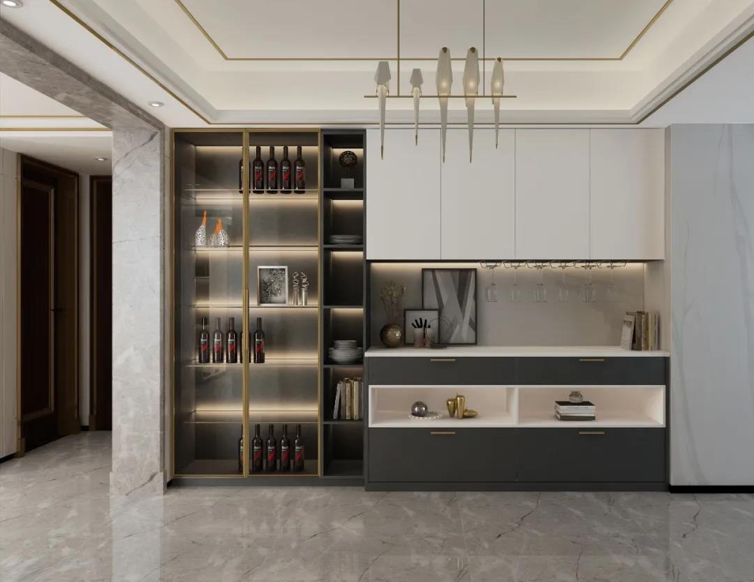 酒柜+餐边柜二合一的设计,能大大增加餐厅或厨房的储物空间,释放餐厅的收纳、展示和储存功能,多采用储酒架、开放格、透明柜门等设计,让空间更明亮通透、条理分明,营造出饮酒品茶的惬意氛围。