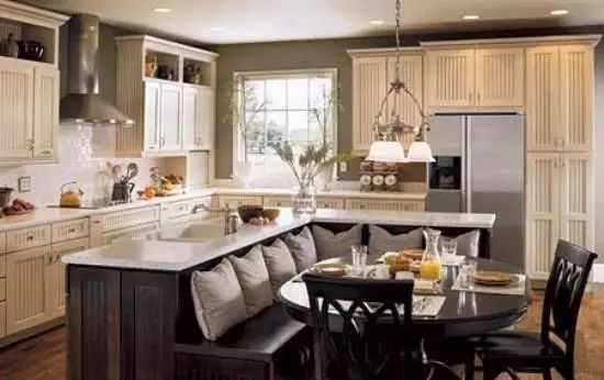 还可以在岛台下面打个连体卡座,让卡座中空用于收纳,放上坐垫再配上一把小桌子,就成为小餐厅或小客厅了!