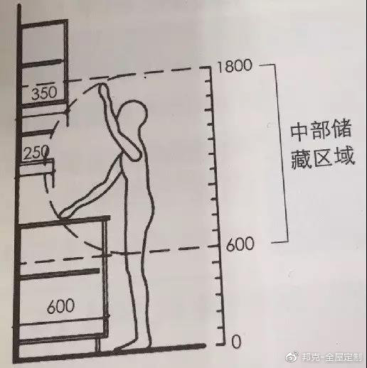 中部局域指距离地面600-1800mm的范围,是以人肩为轴,上肢半径活动的范围,是存取物品最方便,使用频率最高,也是人视线最易看到的区域。